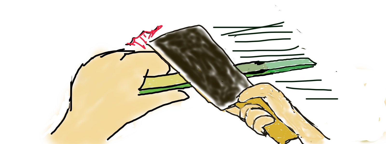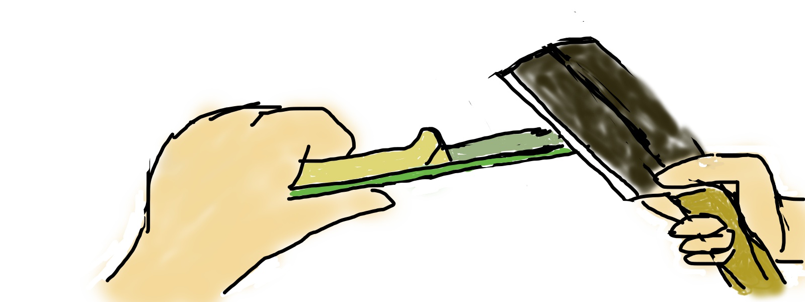 2015 8/26 晴れ 竹割り鉈で指を切ってしまいました! 四万十市の天気 2015年08月26日 先週の金曜日のことですが、鉈で指を切ってしまいました。竹ひごを作っている最中に起こった事件です。 竹ひごを作るには、まずノコギリで竹を伐って、それを竹割り鉈で縦に割ります。だいたい6分割にして、それを鉈を使って身と皮をはいでいく作業のときに起こりました。どんな作業かというと。。 絵を描いてみました、、、持っているのが分割した竹で、真ん中の出っ張りは節といいます。竹を想像してもらえば分かると思うのですが、竹には30センチくらいの間隔で横に線が入っています。その裏にあるのが厄介な節です。 左から内側の身をはいでいる途中、節の部分で切れたので鉈を左にガンガンとすべらして削りとろうとしていました。すると事件が起こりました。こんな風に。。 絵を描いてみました、、、この硬い節を通り越して、左人差し指にザシュッ!と当ててしまいました。するとすぐに指から血が吹き出てきました。 びっくりしましたが、ただひたすら家に帰る用意をしました。その最中も血が吹き出ていましたが、バンドエイドもないのでとにかく早く家に戻りました。 家に帰ったときは、血は止まっていました。手は血まみれになっていましたが、縫うほど深くなかったのでバンドエイドで済ましました。 で現在に至りますが、まだ指を曲げると痛いので時間が掛かりそうです。 PR